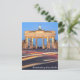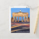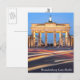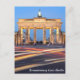 A nighttime photograph of the Brandenburg Gate in Berlin with traffic trails is featured on this postcard.