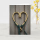 This card shows two curved brass hooks arranged into a heart shape, their warm, worn shine catching soft light in a way that feels quietly romantic ❤️. A dark green paracord wraps around the hooks, pulled snug with small, careful knots that read like a steady promise between two parts meant to stay together 🥰. The background is a pale, weathered wooden surface, lightly blurred so your eye stays on the heart at the center. The brass has a gentle patina, with tiny marks and golden highlights that suggest it’s been held and used over time. The cord’s deep green color adds a calm contrast, and its woven texture looks touchable against the smooth metal curves. A short line of text sits along the bottom in small, white lettering, with a second, even smaller line tucked beneath it in the same color. One end of the paracord trails downward and slips out of the frame, and faint plank seams run diagonally through the soft-focus wood behind it.