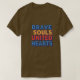 The "Brave Souls United Hearts" t-shirt features a bold, central image of intertwined hearts, symbolizing unity and courage. The design incorporates vibrant colors and subtle, abstract patterns representing strength and resilience. The phrase "Brave Souls United Hearts" is elegantly scripted below, embodying solidarity and the fearless spirit of togetherness.