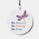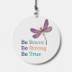 Charming wind charm features Be Brave, Be Strong, Be True. text with purple dragonfly
