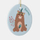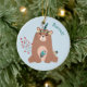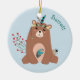 This is a cute ornament for a baby or toddler, for Christmas, birthday, or any time. The front features an adorable brown bear with a tribal headband and feathers. He sits holding another feather, with a red berry bush behind him. Your child's name is at the upper right. The back of the ornament has the stylized text "Be Brave Little One". Beneath it is a pink heart with an arrow through it.