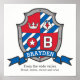 Knights style shield monogram letter B art name poster perfect for a boys bedroom or playroom in shades of red, blue white and gray. Personalize with your child's own name and name meaning for a personalized touch to your child's bedroom or nursery, this example is for the name Brayden FRom the wide valley. Broad, brave, clever and wise. Poster print ideal for a gift to a new baby boy, for a christening, baby naming or baby shower gift. Unique shield drawing, graphic art, name research, wording and design by Sarah Trett. www.sarahtrett.com for www.mylittleeden.com