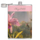 This pretty orchid flask features a painterly version of the amazing work of the Amazon rain forest by Martin Johnson Heade. Your or your recipient's name s monogrammed at the top on a coordinating pink, set off by a silver colored border. This artwork features a closeup of a pink exotic Cattelya orchid with 3 Brazilian hummingbirds. A simulated photo/watercolor filter was run on the image to bring out its luminosity. This beautiful 1871 work is in the public domain and made available to Flickr commons by Swallowtail Garden Seeds. This lovely flask would make a great gift for a gardener or loved one who enjoys art and flowers.