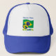 Trucker hat shows the word BRAZIL, in the colors of the Brazilian flag, featured under the flag of Brazil. Above is a soccer ball, also in flag colors. The flag itself flies above and behind it all. Add a name, in blue letters, above the design for a personalized touch. Background is light blue.Fun way to show support for TEAM BRAZIL during international and world soccer meets. Great gift for your favorite Brazilian. Fun to wear to family reunions and sports clubs.