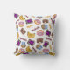 Decorative throw pillow features an original marker illustration of an assortment of breakfast foods including eggs, pancakes, bacon, toast with jam, blueberry muffins, and grapefruit slices.
