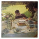 This design features a painting by the Italian artist Giuseppe de Nittis (1846–1884). It shows a family eating breakfast at a formal table in the garden. A woman and young boy are sitting at the table, and there is an empty seat, perhaps where the lady's husband had been sitting. There are ducks and swans walking on the grass in the garden, and the boy is attempting to feed one of the birds with his food. The family is eating from fine porcelain plates and there is white linen on the table. There is also a bouquet of flowers in a vase on the table. The original art was painted by Giuseppe de Nittis in 1883.