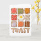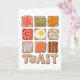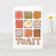 Original illustration of six pieces of toast with jam, or jelly, asparagus, peanut butter, tomato slices, a fried egg, mushrooms, sardines, baked beans, and sausages. Delicious choices for a filling, yummy breakfast or brunch.