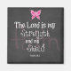 Breast Cancer Awareness Bible Verse Gifts. Vintage inspired black background with the word 'faith' in light pink behind the bible verse, "The Lord is my strength and my shield" (Psalms) with a pink awareness ribbon butterfly accent. Inspirational and motivational comforting message.