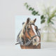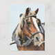 A digital watercolor portrait made from a photo of a French chestnut draft horse with flaxen mane and white blaze, hitched, waiting and ready to go, in harness with a collar, traces and a decorated browband.