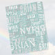 This blanket is not only a source of comfort but also a canvas for a unique and trendy design. The contemporary aesthetic of white and gray fonts, repeated all over the light-teal-blue background, creates a captivating pattern that stretches in all directions, adding a touch of modern elegance to any space.