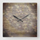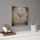 This is a square clock with various glittering hearts all over the aged brick wall.