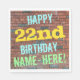 This fun birthday-themed paper napkin design features a message like "HAPPY 22nd BIRTHDAY, NAME-HERE!", where the name can be personalized. The background features a representation of a brick wall consisting of some reddish-brown colored bricks. The customizable message text features colors like blue, yellow, and green, and it has an appearance inspired by that of painted graffiti. Napkins like these could perhaps be used at a birthday party for somebody who is celebrating their twenty second birthday. [~Z0000271]