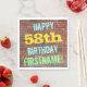 This fun birthday-themed paper napkin design features a message like "HAPPY 58th BIRTHDAY, FIRSTNAME!", where the name can be personalized. The background features a representation of a brick wall consisting of some reddish-brown colored bricks. The customizable message text features colors like blue, yellow, and green, and it has an appearance inspired by that of painted graffiti. Napkins like these could perhaps be used at a birthday party for somebody who is celebrating their fifty eighth birthday. [~Z0000271]