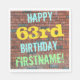 This fun birthday-themed paper napkin design features a message like "HAPPY 63rd BIRTHDAY, FIRSTNAME!", where the name can be personalized. The background features a representation of a brick wall consisting of some reddish-brown colored bricks. The customizable message text features colors like blue, yellow, and green, and it has an appearance inspired by that of painted graffiti. Napkins like these could perhaps be used at a birthday party for somebody who is celebrating their sixty third birthday. [~Z0000271]