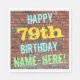 This fun birthday-themed paper napkin design features a message like "HAPPY 79th BIRTHDAY, NAME-HERE!", where the name can be personalized. The background features a representation of a brick wall consisting of some reddish-brown colored bricks. The customizable message text features colors like blue, yellow, and green, and it has an appearance inspired by that of painted graffiti. Napkins like these could perhaps be used at a birthday party for somebody who is celebrating their seventy ninth birthday. [~Z0000271]