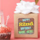 This fun birthday-themed sticker design features a message like "HAPPY 82nd BIRTHDAY, NAME-HERE!", where the name can be personalized. The background features a representation of a brick wall consisting of some reddish-brown colored bricks. The customizable message text features colors like blue, yellow, and green, and it has an appearance inspired by that of painted graffiti. Stickers like these could perhaps be given as a birthday gift, or perhaps be used as decorations at a birthday party for somebody who is celebrating their eighty second birthday. [~Z0000273]
