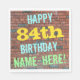 This fun birthday-themed paper napkin design features a message like "HAPPY 84th BIRTHDAY, NAME-HERE!", where the name can be personalized. The background features a representation of a brick wall consisting of some reddish-brown colored bricks. The customizable message text features colors like blue, yellow, and green, and it has an appearance inspired by that of painted graffiti. Napkins like these could perhaps be used at a birthday party for somebody who is celebrating their eighty fourth birthday. [~Z0000271]