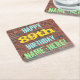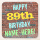 This fun birthday-themed coaster design features a message like "HAPPY 89th BIRTHDAY, NAME-HERE!", where the name can be personalized. The background features a representation of a brick wall consisting of some reddish-brown colored bricks. The customizable message text features colors like blue, yellow, and green, and it has an appearance inspired by that of painted graffiti. Coasters like these might be useful as practical decorations at a birthday party for somebody who is celebrating their eighty ninth birthday. [~Z0000288]