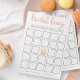 The classic bridal shower bingo game on a pretty card featuring a handwritten-style typeface and two tasty French macarons in pastel pink and yellow.