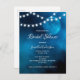 A romantic invite card for a rustic bridal shower . A dark blue evening and night with a full moon and string lights. Templates for date, name, event place, and RSVP details. The name is written with a modern hand lettered style script. White letters.