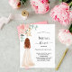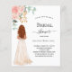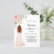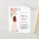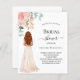 A white background. A bride, pink roses and eucalyptus greenery. Personalize and add a name and party details.