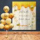 Fun summer bridal shower tapestry. Yellow, white background with a honeycomb pattern. With a faux gold geometric frame. Decorated with light yellow, cream colored tropical florals flowers, hibiscus and happy bumble bees and sweet gold dripping honey. With the text: Bride to Bee. Personalize and add name of the bride to bee. Can be used as wall decor for the bridal shower or as a photo backdrop.