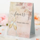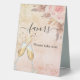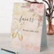 For a Bridal Shower. A rose gold and pink rustic gradient background, pink flowers and pampas grass. Bubbles and a pair of flutes. Text: Favors. Please take one!