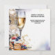 Beautiful watercolor white roses on a white background have a flute of sparkling wine nestled amongst them and a stack of flapjacks covered in drizzling chocolate sauce; whipped cream, blueberries and strawberries. The bubbly appears to shimmer and shine against a white background that has a horizontal wedding flourish divider between black custom text templates. The back has the same design with additional templates for extra information you may want your guests and family to know. If not required, delete the wording to leave the line blank. This stylish, modern, elegant and trendy design is also ideal for any bridal shower; birthday or cruise celebration. Spoil the bride to be with this bespoke and timeless square invitation