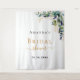 A chic white background. Decorated with green watercolored eucalyptus leaves, sprigs, greenery and a faux gold leaves. Personalize and add the name of the bride to be and a date. Black and golden letters. Can be used as a Bridal Shower welcome banner, as party wall decoration or as a photo booth backdrop.