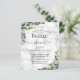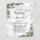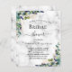 Marble print as background decorated with eucalyptus greenery and golden foliage. Personalize and add a name and party details. Black letters.