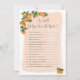 Vibrant bridal shower game featuring original hand-painted illustration of fresh citrus oranges and greenery foliage