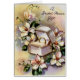 Vintage bridal shower gift card featuring a group of white flowers and nestled between is a jewelry box with an engagement ring. Lovely soft colors and style