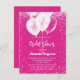 A hot pink background. Decorated with pink confetti and white balloons. White text. Personalize and add a name and party details.