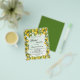 A green watercolored background. Decorated with yellow lemons and green foliage. Personalize and add a name and party details. The name is written with a hand lettered style script.