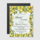 A green watercolored background. Decorated with yellow lemons and green foliage. Personalize and add a name and party details. The name is written with a hand lettered style script.