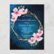 An elegant tropical summer bridal invitation. With a faux gold geometric frame decorated with pink hibiscus, flowers tropical florals with some greenery. A dark blue tropical night sky as background.