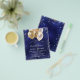 A modern, stylish and glamorous bridal shower invitation. A navy blue background, decorated with blie and faux gold glitter sparkles and golden balloons. The blue color is uneven. Personalize and add a name and party details.