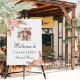 A welcome board for an elegant and modern bridal shower. White background, decorated with boho style pampas grass and rose gold and blush pink florals. Personalize and add a photo, name.