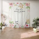 Bridal Shower / Wedding Celebration Photo Booth Backdrop Templates - Elegant Lettering Script and Vintage Watercolor Pink Flowers on Rustic White Wood Background.