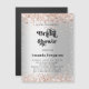 A faux silver looking background. Decorated with rose gold faux glitter. Personalize and add a name and party details. The name is written with a hand lettered style script