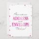 This modern "Write your name and address on an envelope" sign features a pink magenta background with metallic confetti. The text is written in a mix of a playful calligraphy font and a modern serif font.