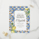 Composed of serif and cursive script typography. All against a watercolor backdrop of blue and white Mediterranean Spanish tiles with greenery foliage leaves, lemons and wild floral flower botanicals.