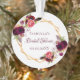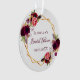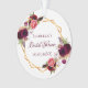 A trendy Bohemian boho style ornament for a bridal shower. Decorated with watercolored roses in burgundy and pink. Elegant white background. A faux gold geometric frame. Templates for the bride's name and a date. With the text: Bridal Shower written with a hand lettered style script. Burgundy colored letters. Great as a gift for the bride as a keepsake or as a favor, save the date reminder for the guests!
