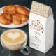These pretty roasted coffees make perfect wedding or bridal shower favors. The design includes two watercolor coffee cups and beans with floral accents in shades of sage green, dusty vintage pink, and coffee brown. The background has a very light mottled beige watercolor look and a coffee bean border at the top. The text reads, "the perfect blend." Below that, there is room for you to personalize with the couple's names, wedding date, and thank you.