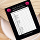 Looking for a fun bridal shower word scramble game. This bridal word scramble features 20 wedding related words for your shower guests to unscramble. Two bouquets of pink roses appear on a black background with the word scramble right below. The great thing about this design is you can personalize the design with the name of the bride! A fun word scramble game for a bridal shower or wedding shower. Copyright henishouseofpaper