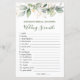 This design features watercolor illustration of green and gold foliage with golden effect confetti. Greenery Bridal Shower Games - Double sided card - Two games in One! Bridal What's in your Purse Game in the front of card and Wedding Scramble game on the reverse. The answer key for Wedding Scramble game: Bride, Groom, Wedding Cake, Honeymoon, True Love, White Dress, Lace, Happiness, Unity Candle, Bridesmaid, Groomsmen, Officiant, Chapel, Marriage Vows, Ring Bearer.