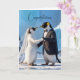 A pair of penguins is dressed in wedding attire, standing together against a snowy, mountainous backdrop.