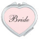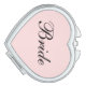Compact mirror shown in a heart shape with a blush pink background color with Bride text in black.