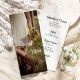 Customize the informal yet elegant Bride, Cowboy Boots and Sunflowers Ranch Wedding Menu with the details of the meal that you will serve at your rural country theme bridal shower luncheon, rehearsal dinner or marriage reception dinner by adding the salad or first course, entree or second course and dessert or third course. This charming custom rustic chic nuptial menu features a quaint farm style photograph of a cowgirl bride wearing a white lace wedding dress with brown western leather cowboy boots carrying a bouquet of yellow sunflower blossoms with a weathered wooden barbed wire fence in the background with green grass. Perfect inspo for a casual barn party celebration event.