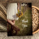 Customize the charming Bride, Cowboy Boots and Sunflowers Country Western Wedding Thank You Postcard with your own personal message of thanks, gratitude and appreciation for gifts received after a casual yet classy rural farm or ranch bridal shower, engagement barn party or marriage theme. This rustic chic custom western thank you postcard features a quaint farm style photograph of a cowgirl bride wearing a white lace wedding dress and brown leather cowboy boots carrying a bouquet of yellow sunflower blossom with a weathered wooden barbed wire fence, barn and silo in the background with green grass.